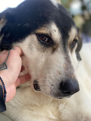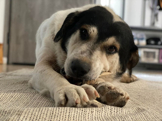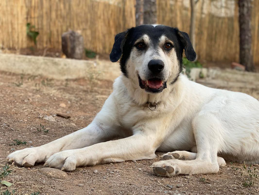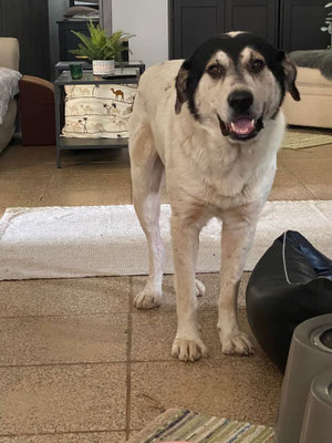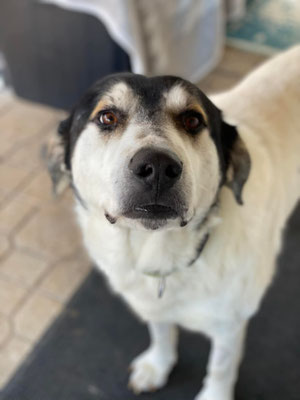 Wir schätzen Athos’ Alter auf etwa 5 Jahre. Zudem vermuten wir, dass in ihm ein Anteil Herdenschutzhund steckt.