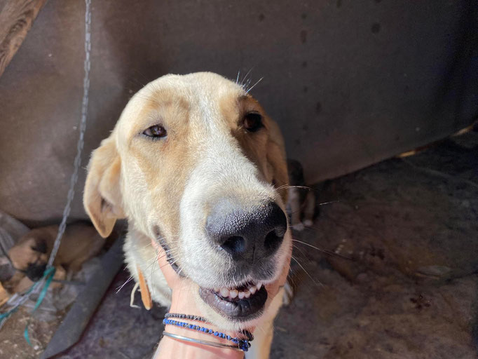 Diese liebe Hündin ist Cora. Wir fanden sie Anfang 2023 mit ihren 5 Welpen in einem unwürdigen, zusammengeschusterten Bereich ohne adäquate Versorgung auf. Mittlerweile haben es alle ihrer Welpen