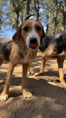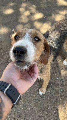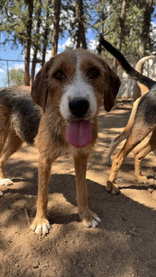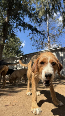 Mama befindet sich in einem griechischen Flüchtlingslager, wo sich die Menschen so gut es geht um sie und weitere Hunde kümmern. Aber leider sind Hunde dort dennoch nicht so richtig gern